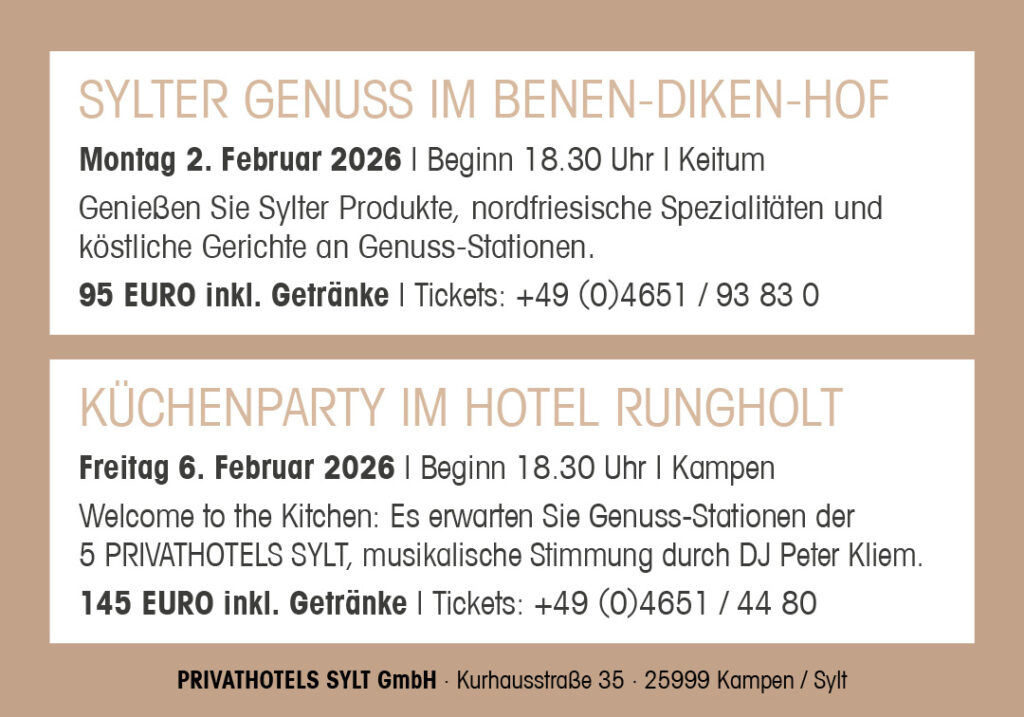 Am Montagabend treffen sich alle Gäste gemeinsam im Benen-Diken-Hof zum ‚Sylter Markt‘. Genießen Sie Sylter Produkte, nordfriesische Spezialitäten und köstliche Gerichte. Der Dienstagabend steht im Zeichen des Sterne-Cookings im Landhaus Stricker: Holger Bodendorf und Felix Gabel kochen für Sie ein kreatives und vielfältiges „Four-Hands-Dinner“. Der Mittwochabend steht zur freien Verfügung. Am Donnerstagabend findet die kulinarische Insel-Rallye statt. Starten Sie das Gourmet-Erlebnis mit allen Gästen im Hotel Rungholt. Im Anschluss geht’s auf Tour: Lassen Sie sich nacheinander im Fährhaus Sylt, im Benen-Diken-Hof und im Landhaus Stricker, genussvoll verwöhnen, bevor Sie im Budersand KAI3 das Dessert genießen. Am Freitagabend feiern wir das Finale unserer kulinarischen Woche mit einer Küchenparty im Hotel Rungholt. Alle Chefköche der Privathotels Sylt werden Sie dort vor Ort verwöhnen.